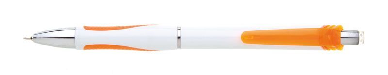 • Der Körper ist weiß mit Chromclip, Clickerkörper und einem Streifen in der Mitte des Stiftkörpers, der Griff ist farbig und teilweise gummiert, ebenso der Clip